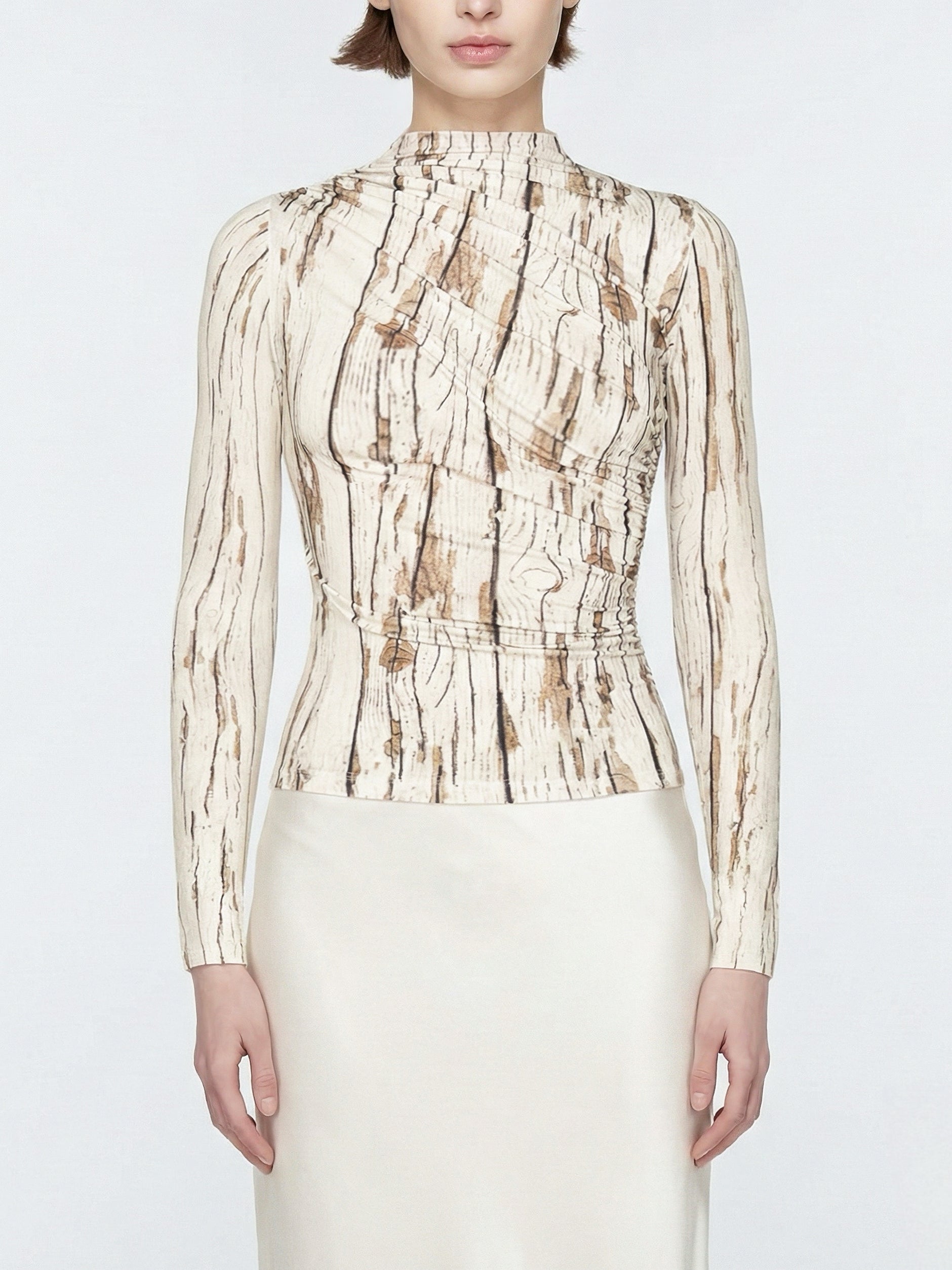 Top manga longa franzido em malha de algodão com elastano e estampa “Palafitas”.